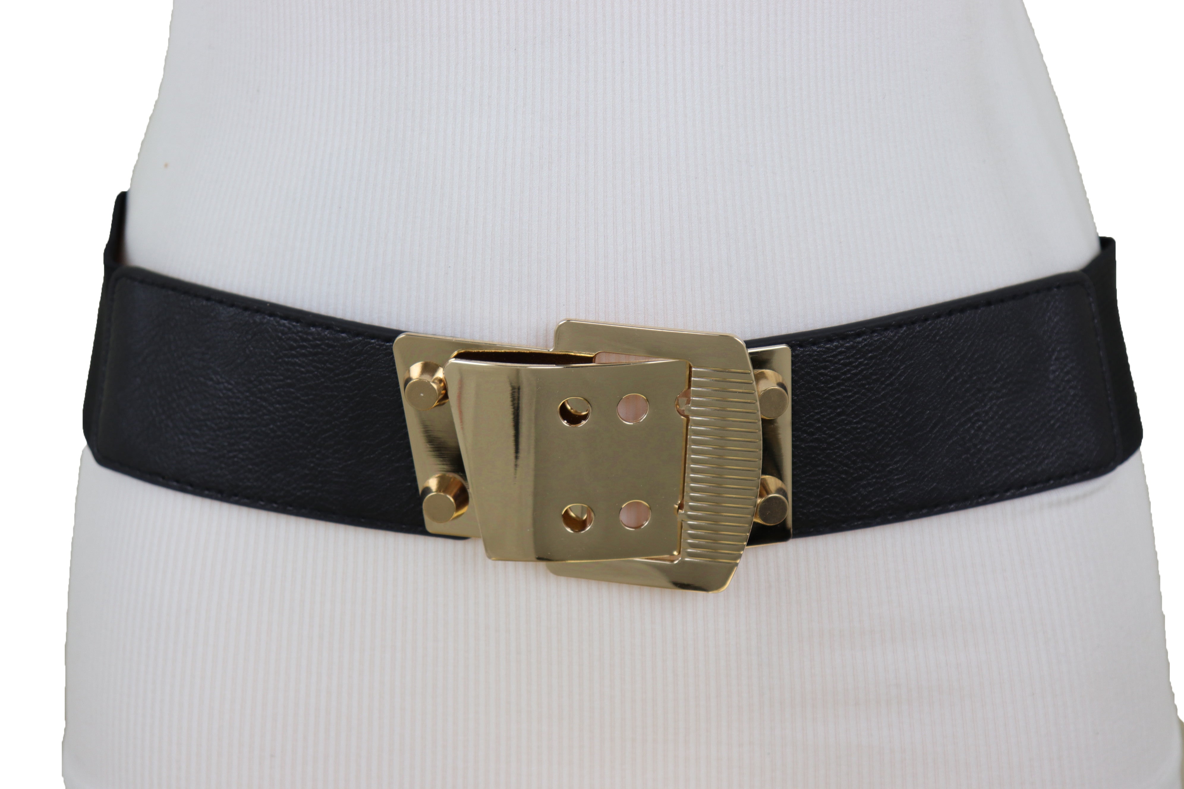 Black Elastic Band Belt High Waist Hip Gold Metal Square Buckle Size S M