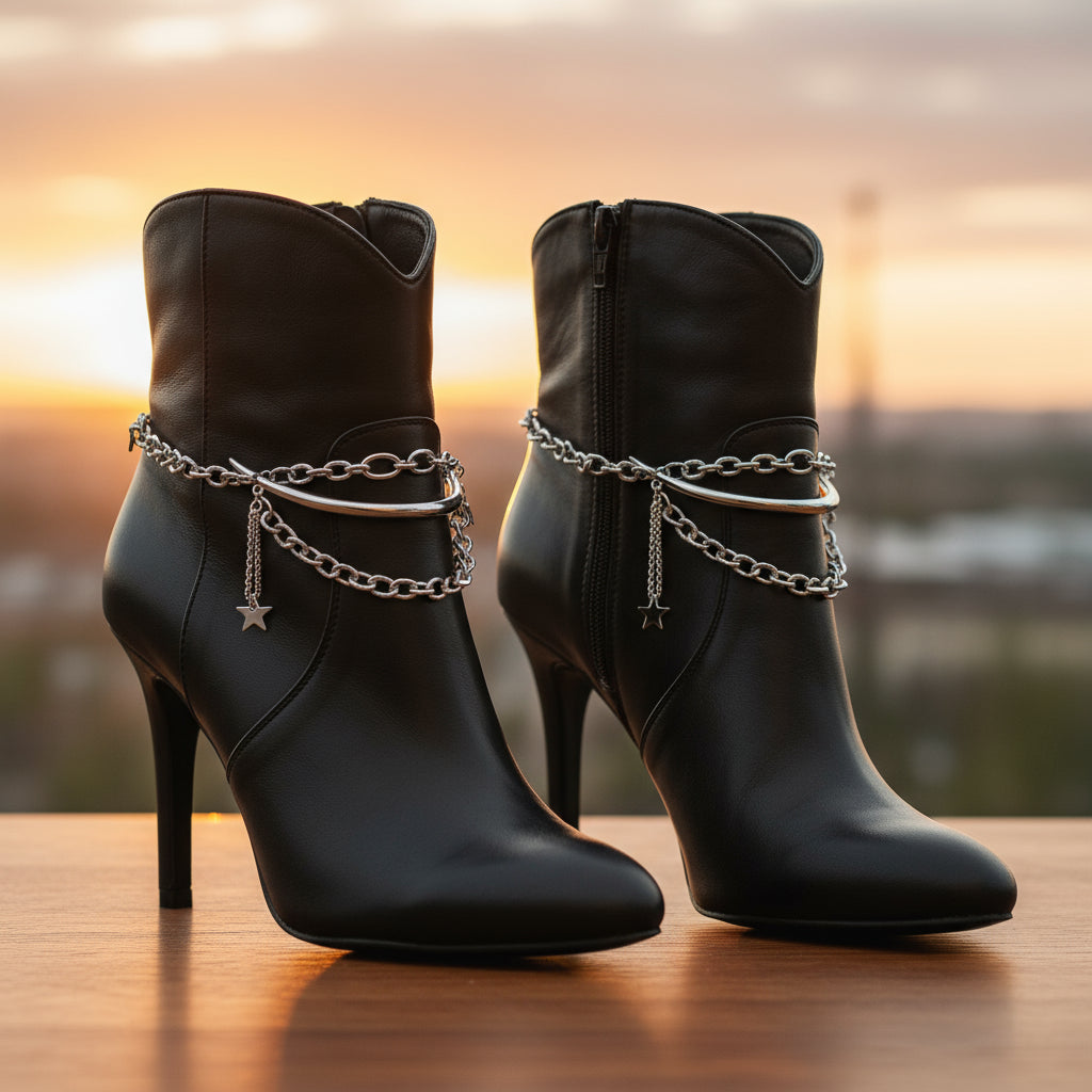 2PCS Silver Boot Chain Anklet Set – Stars & Crescent Moon Charm, Western & Biker Boot Jewelry – Adjustable 11–15 in – Pair, Handmade in USA |