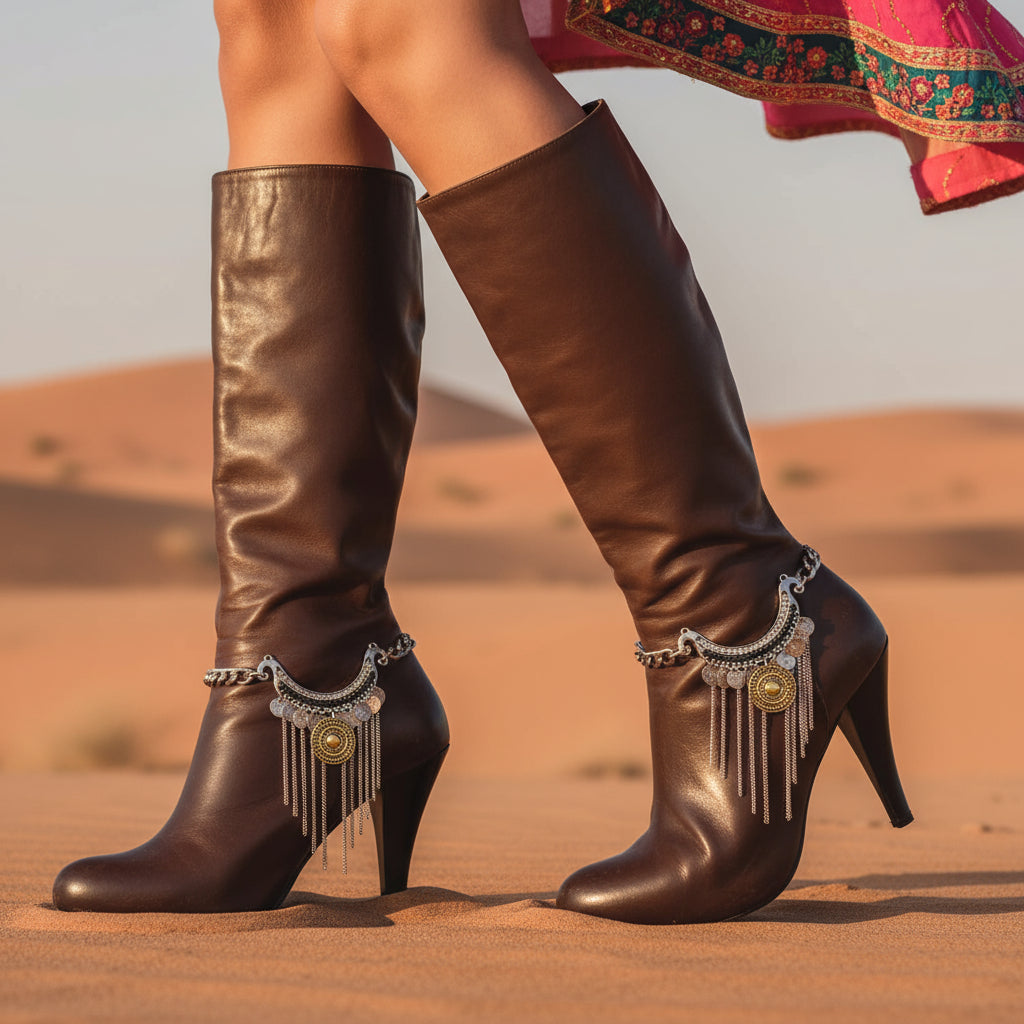 Women’s Boot Chain Anklets, 2 Pcs — Silver Ethnic Fringe Charms w/ Black Beads & Antique Coin, Adjustable 11–15 in — Western Cowgirl Shoe Bracelet, Boot Jewelry — Handmade in USA (BC35)