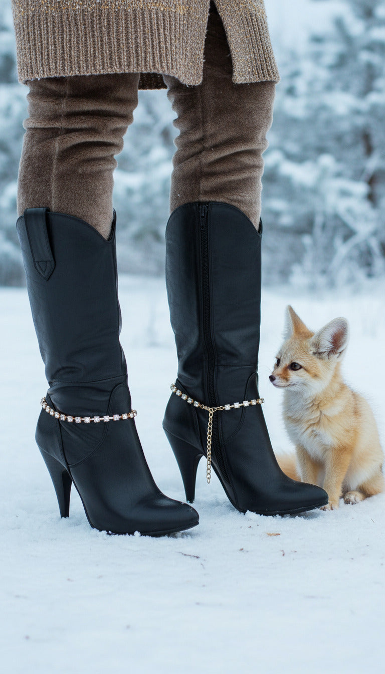 Give your favorite boots a glow-up in seconds with this gold boot chain bracelet set with rhinestone charm detail. Each strap features a line of sparkling silver-tone rhinestones set in warm gold metal for that perfect mix of Western cowgirl energy and classy city glam. Clip them around the shaft or ankle of your boots, adjust the extension chain and watch your everyday footwear turn into party-ready statement shoes.