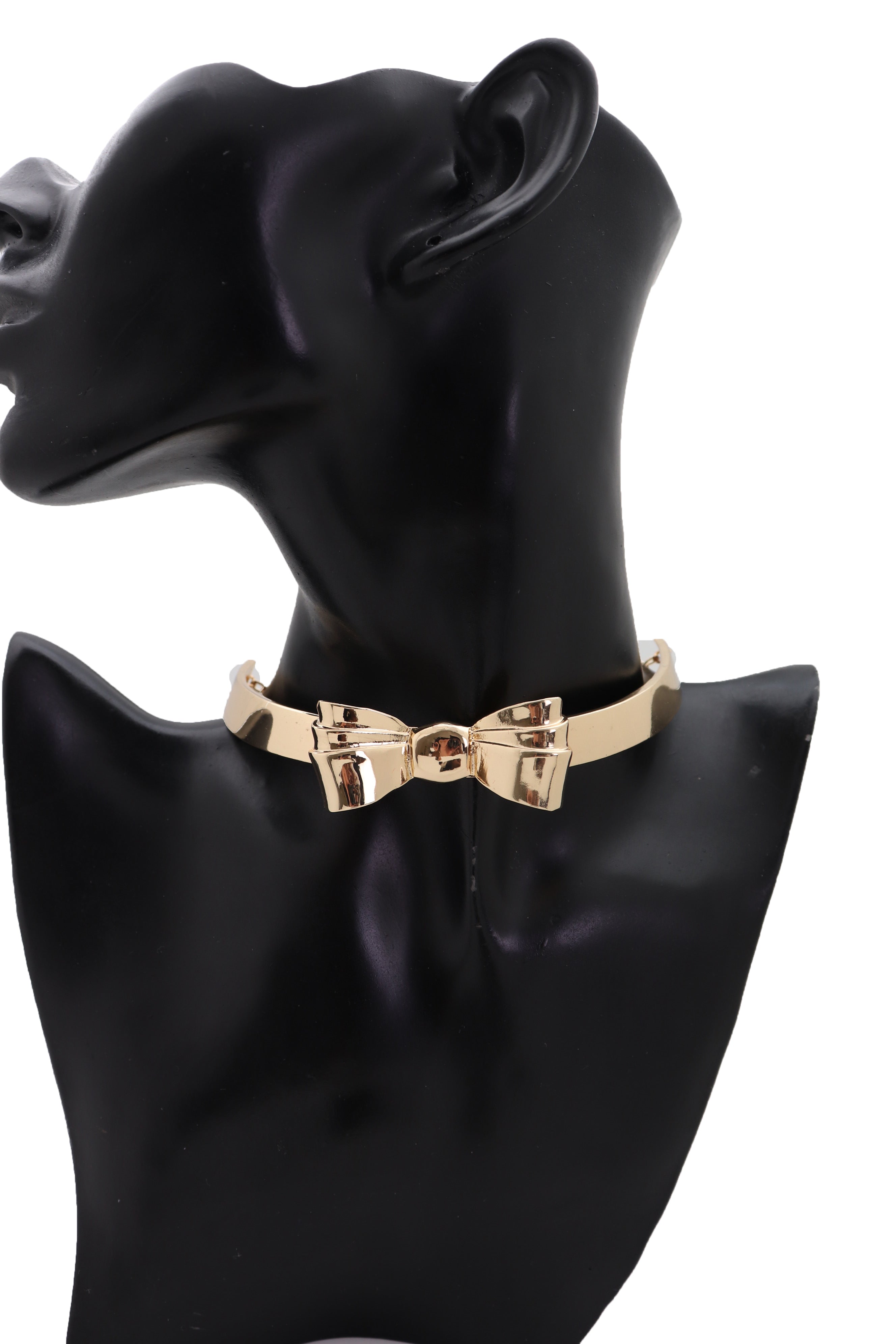 Gold Metal Chain Short Choker Necklace Bow Ribbon Pendant