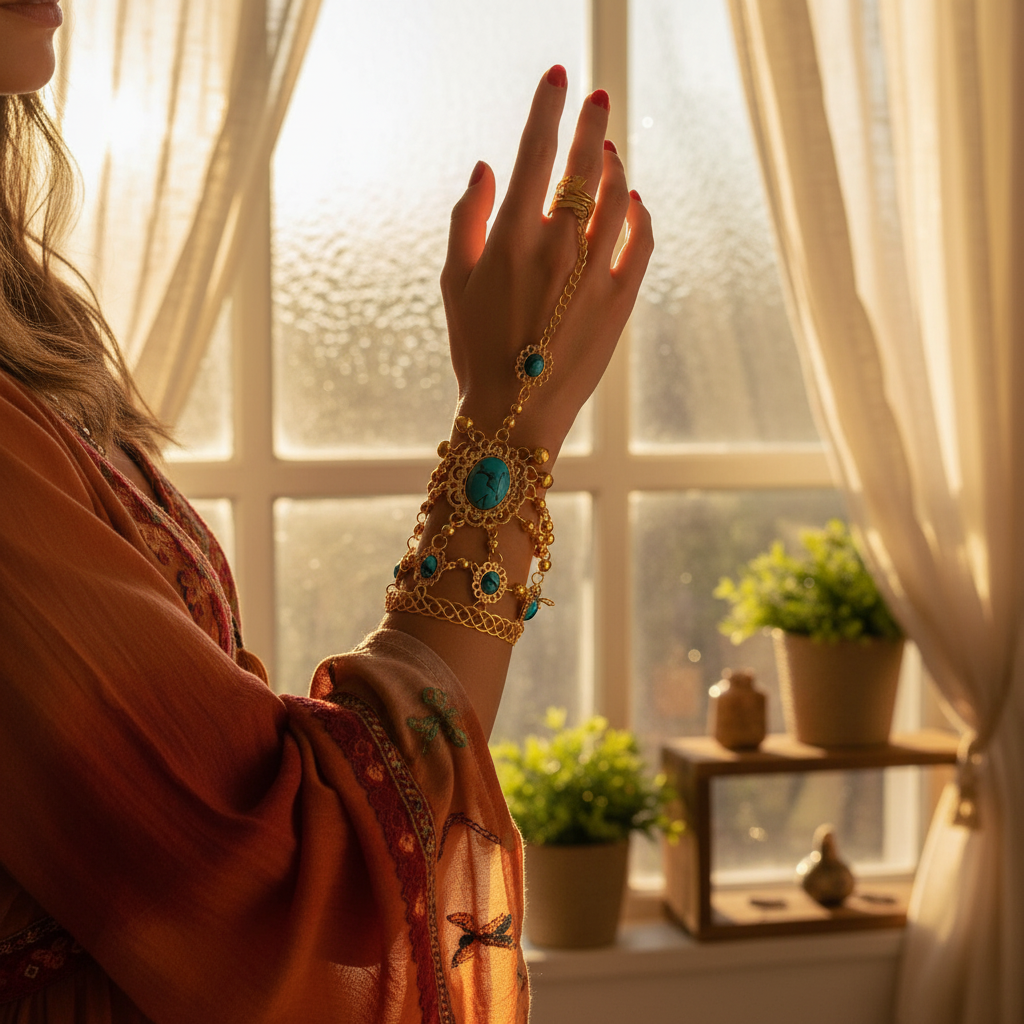 NEW Women Gold Metal Hand Chain Cuff Bracelet Ring Turquoise Blue Color Beads