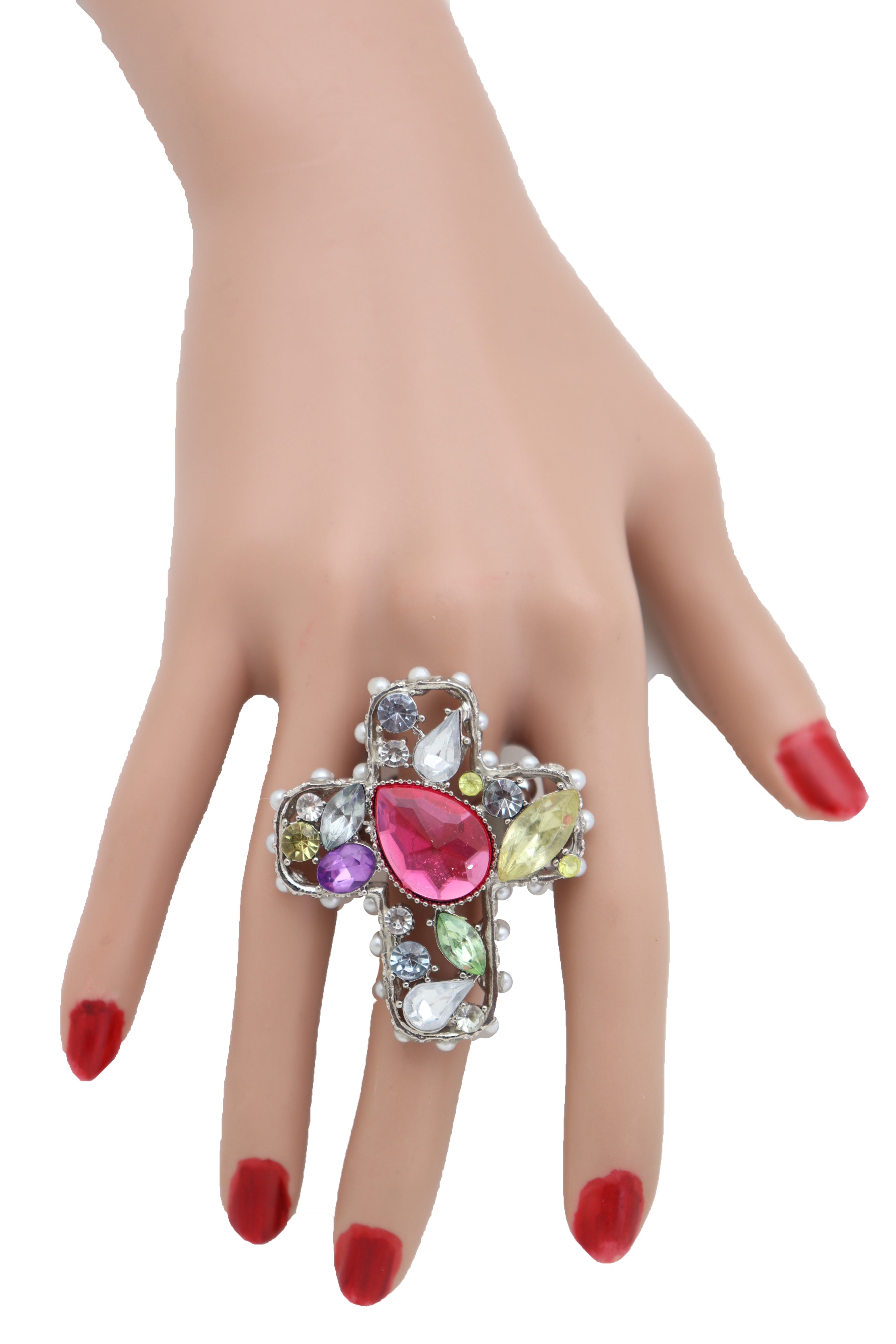 Color : Silver color metal ring and stretch band + silver, green, purple, pink, cream and gold rhinestones beads