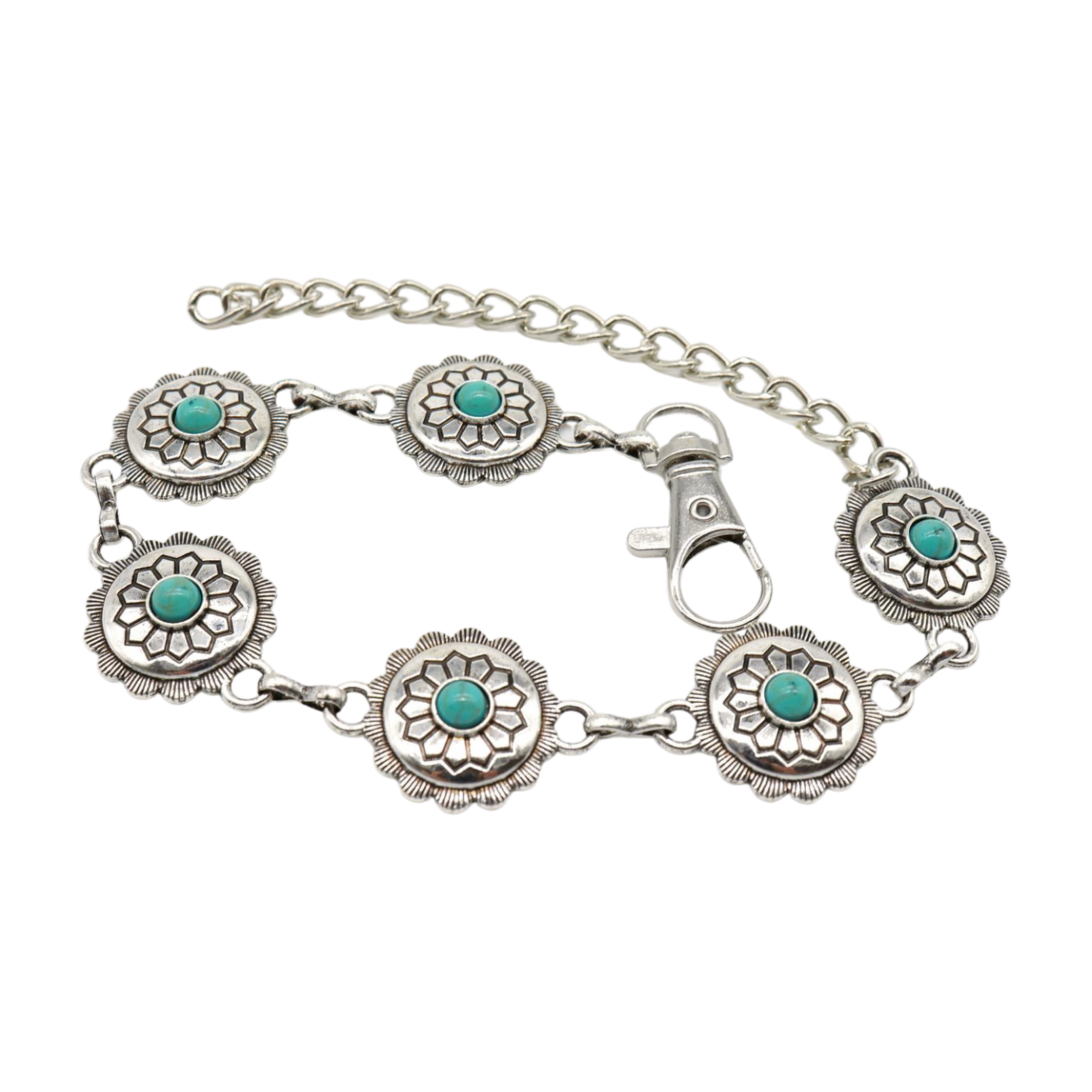 Add a dazzling touch of Western flair with our Women’s Ethnic Silver Metal Boot Chain Bracelet—an exclusive, handmade, and made-in-the-USA fashion statement! Featuring a chic silver chain, a charming flower pendant, and lively blue beads, this single strap chain is perfect for cowboy boots, high heels, or as an ankle accessory. Its adjustable length (10"–15") ensures a comfortable fit with some drape, helping to prevent chain stress or breakage. Whether hitting the rodeo, attending a party, or just adding cool country style to your everyday look, this fun and sexy rodeo jewelry piece will turn heads—wear it day or night, year-round!