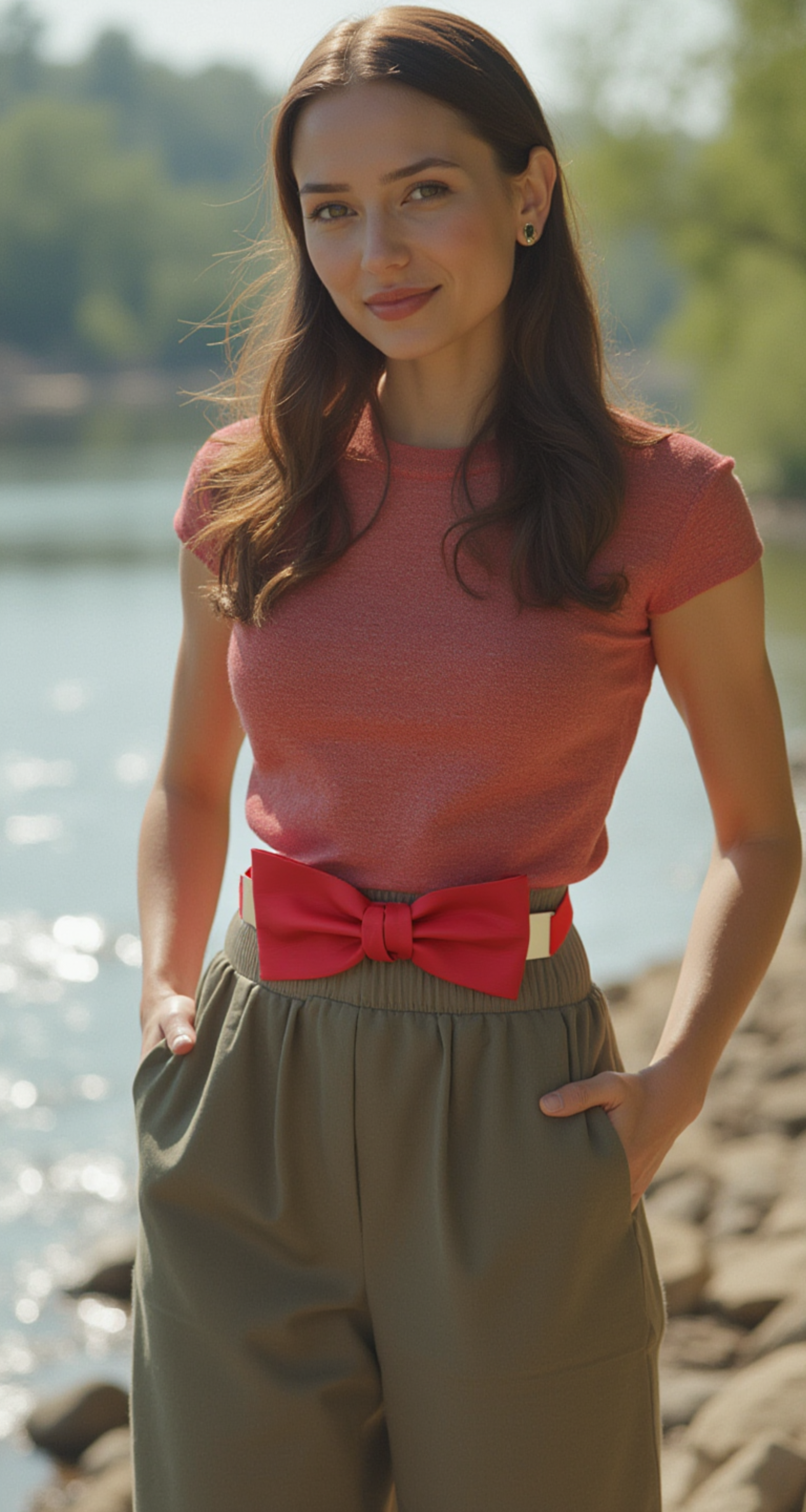 Casual Chic: Pair this belt with a tucked-in blouse and high-waisted jeans for a trendy, effortless look. The bow tie buckle adds a playful touch, making the outfit unique.