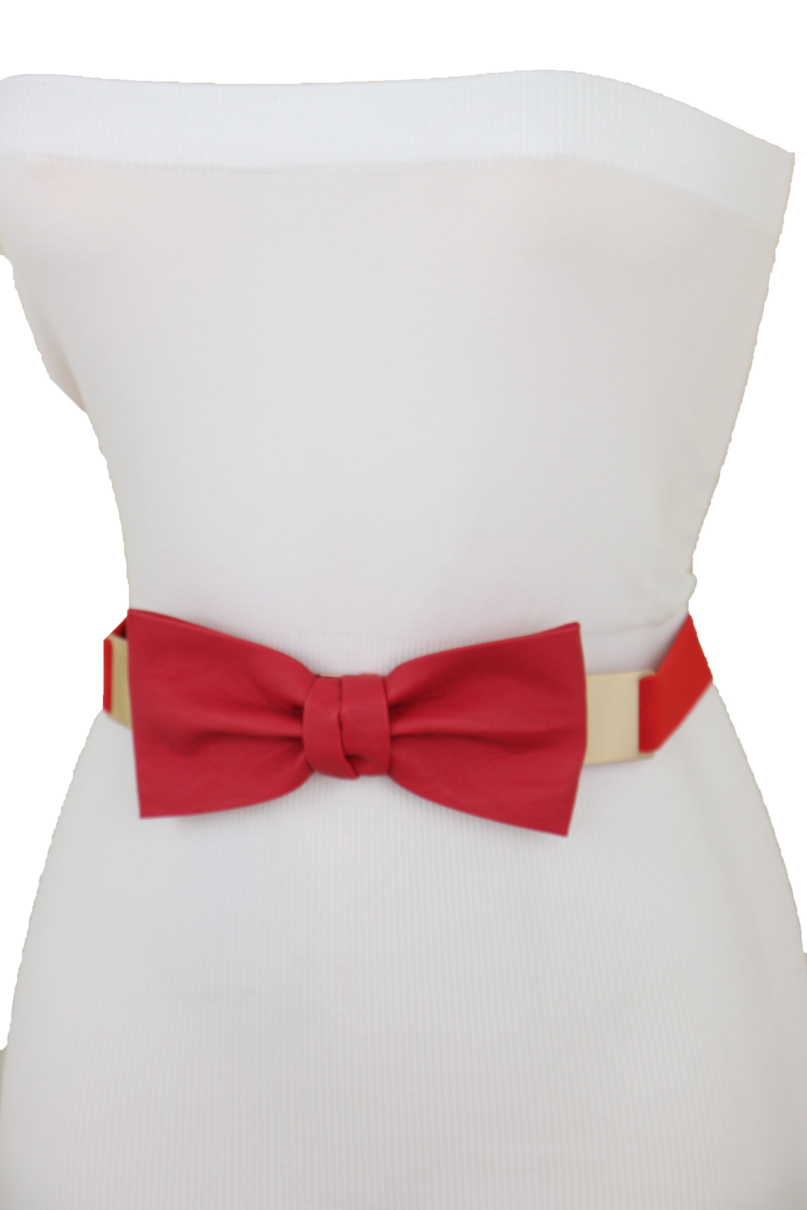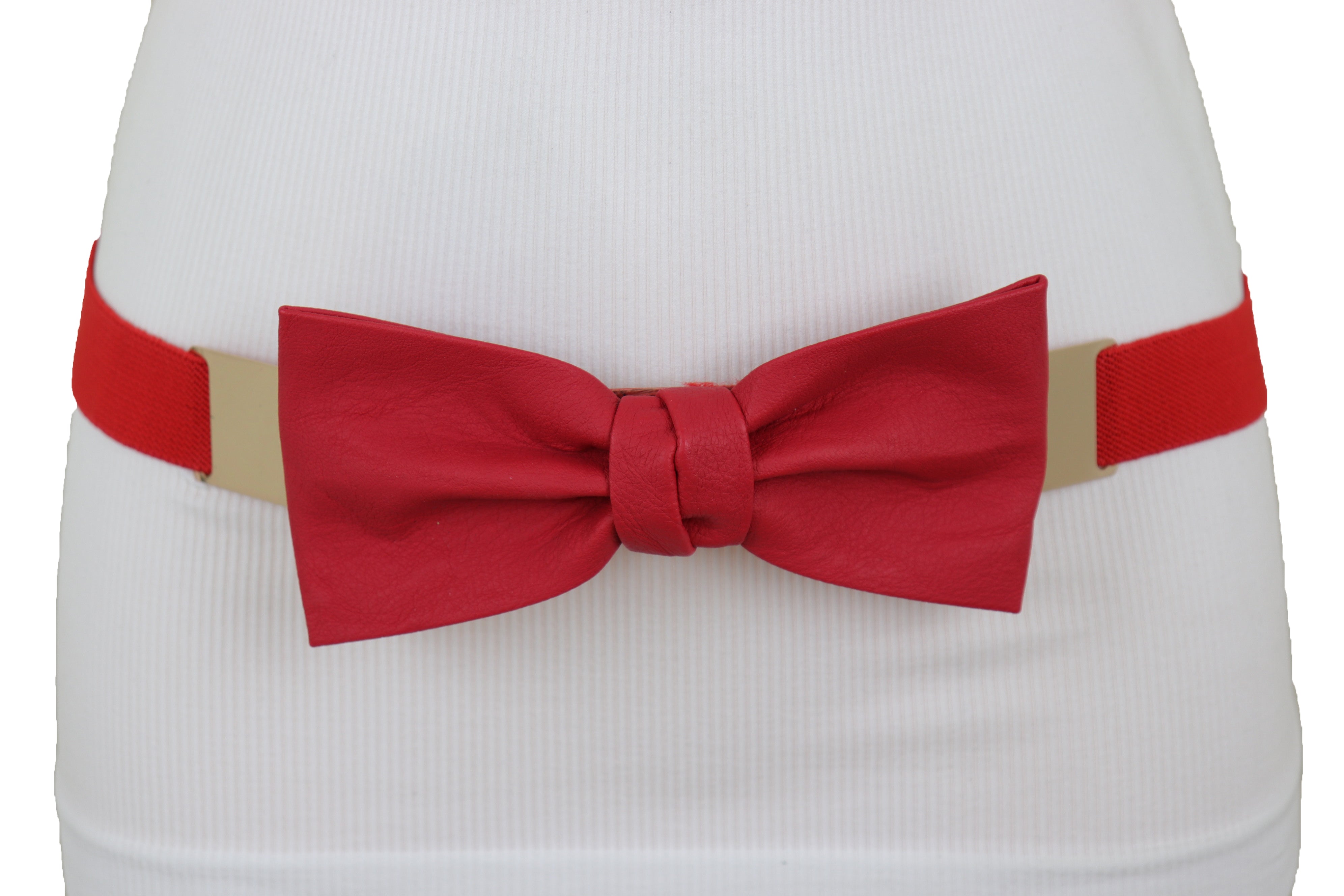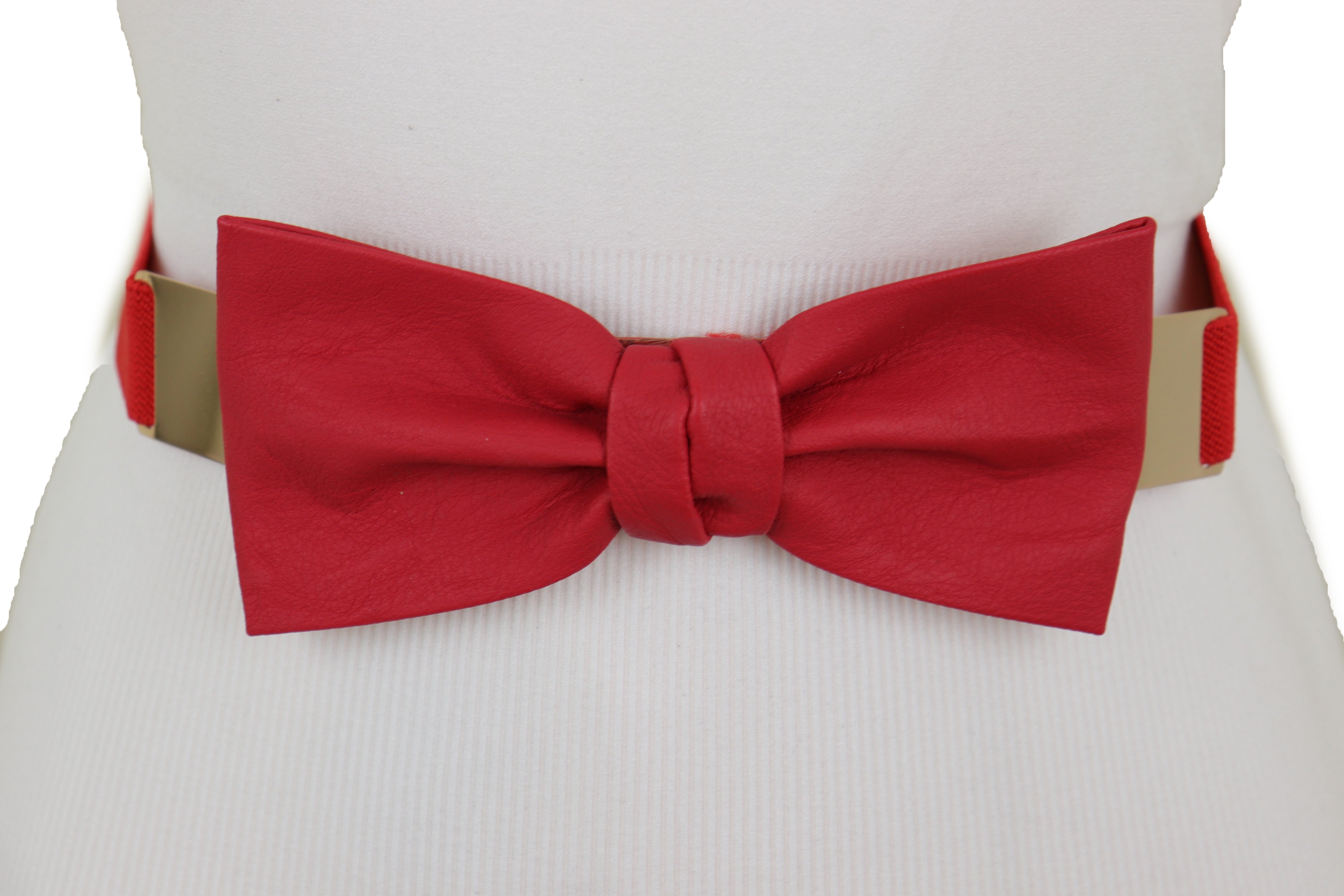 Women Fashion Belt Gold Plate Elastic Band Red Color Bow Tie Buckle Fit Size S L