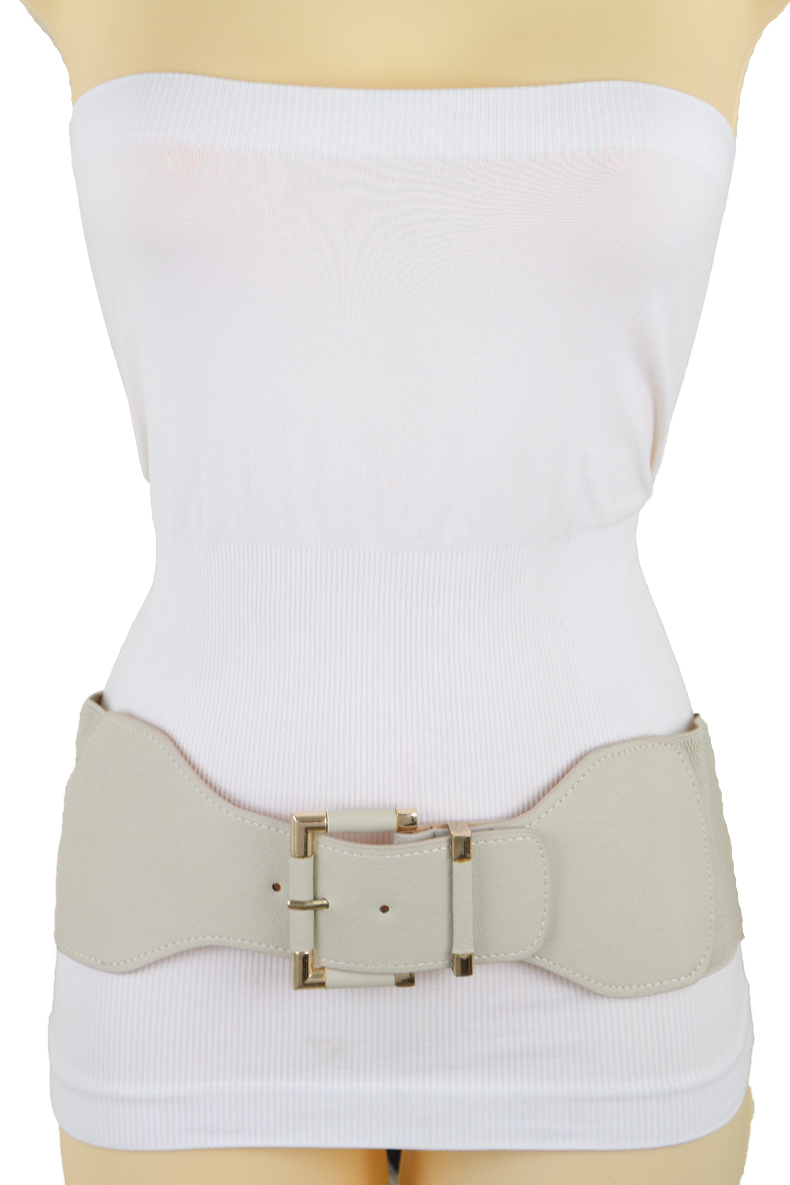 Faux Leather Elastic Waist Gold Square Buckle Belt Size S M