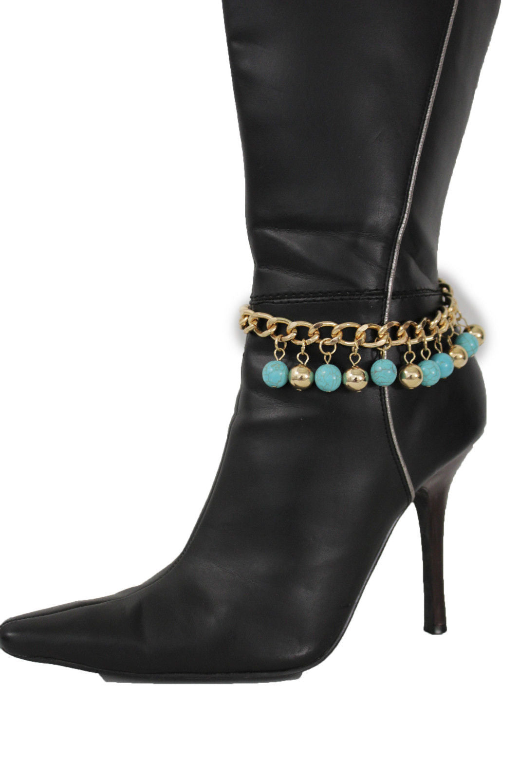 Gold Metal Chains Boot Multi Balls Anklet Shoe Turquoise Blue Women Moroccan Hot Fashion