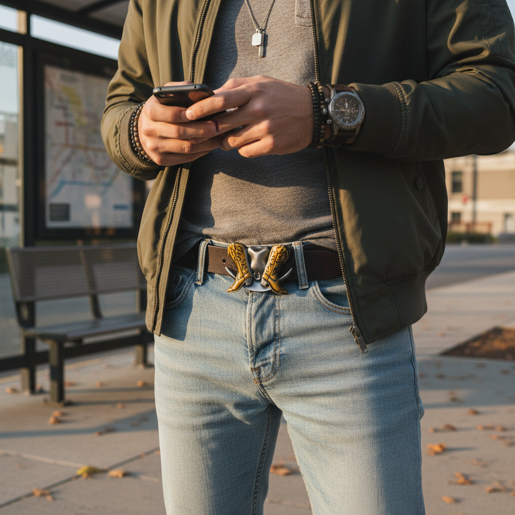 Some buckles are souvenirs; this one tells a story. The Texas-inspired boots and hat sit above a horseshoe for a touch of luck, cast in durable metal and finished in a mellow antique silver that ages gracefully. The raised design catches light without blinding flash, and the amber-tan boot enamel warms up dark denim beautifully.