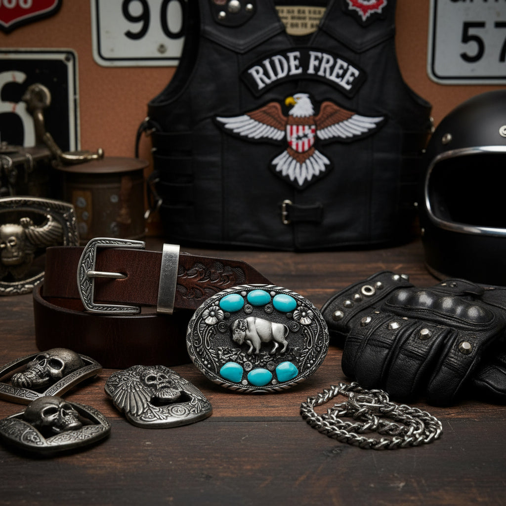 #WesternFashion #BeltBuckle #BuffaloOx #TurquoiseAccents #CowboyStyle #MenAccessories #BikerStyle #FashionStatement