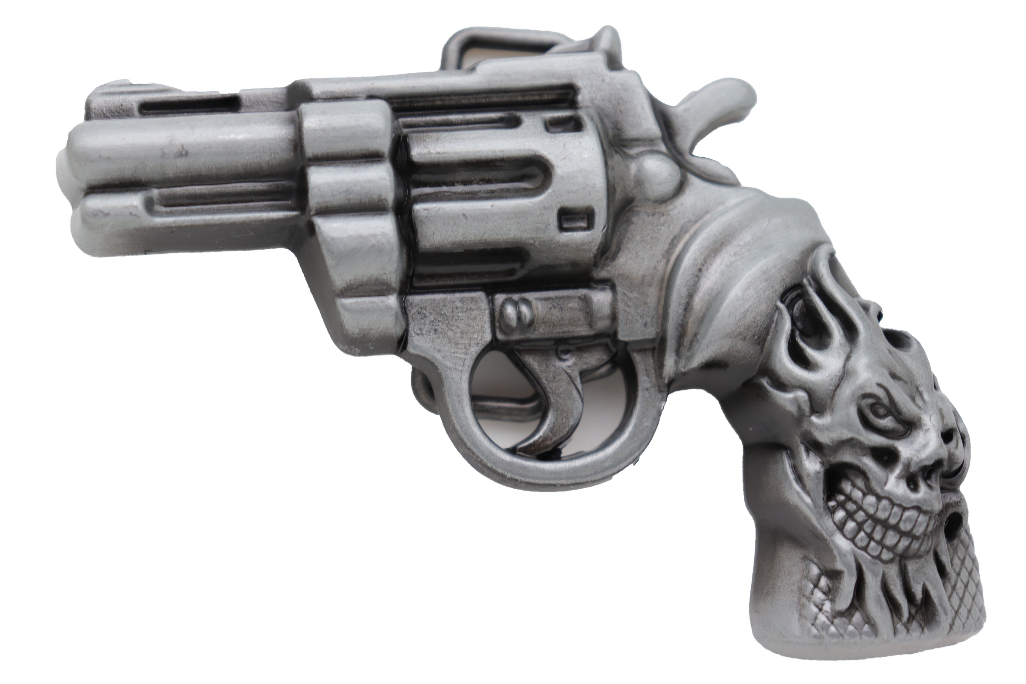Men Silver Metal Western Fashion Belt Buckle Revolver Gun Flaming Skull Weapon