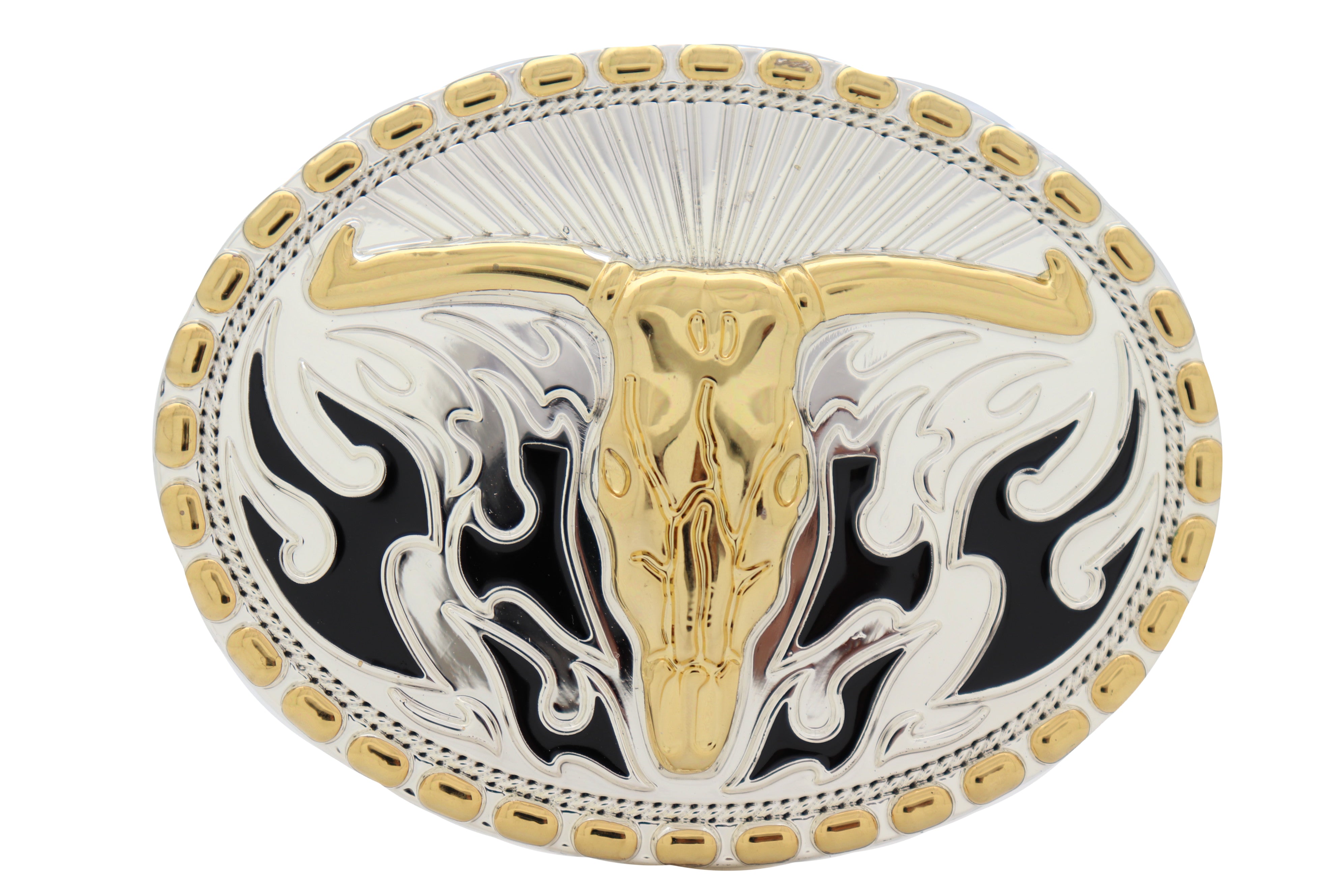 Men Belt Buckle Silver Metal Oval Western Fashion Gold Bull Skull Long Horn Fire