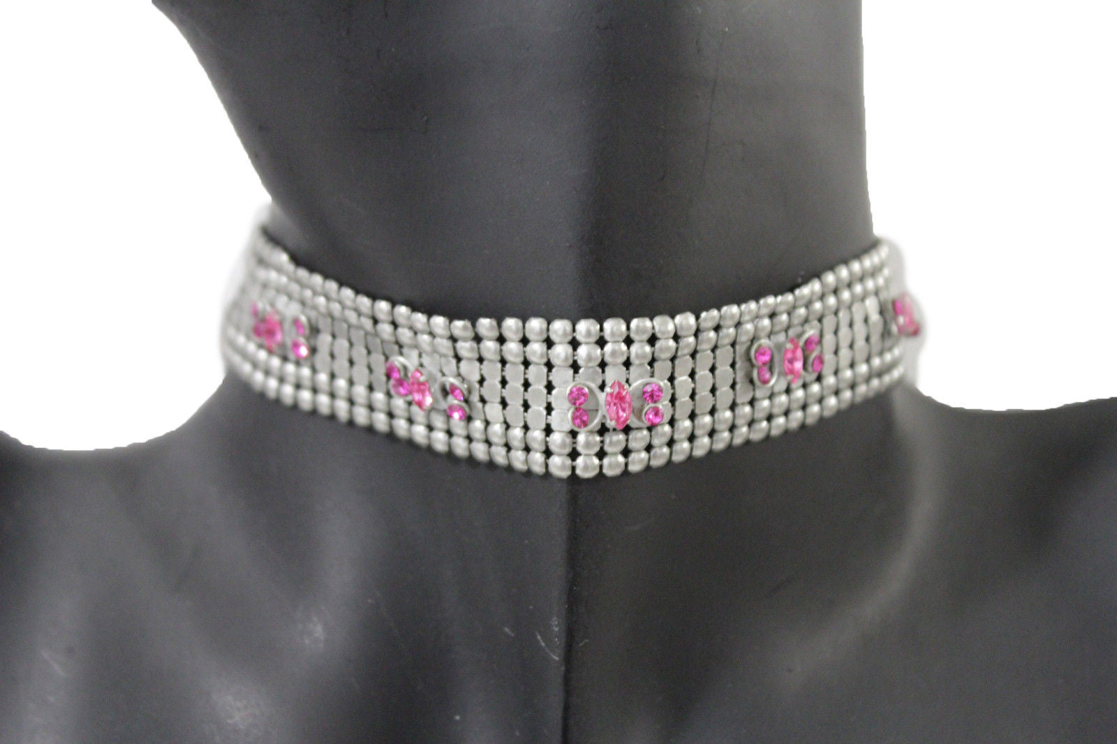 Silver Metal Neck Narrow Choker Necklace Pink Blue Green Butterfly