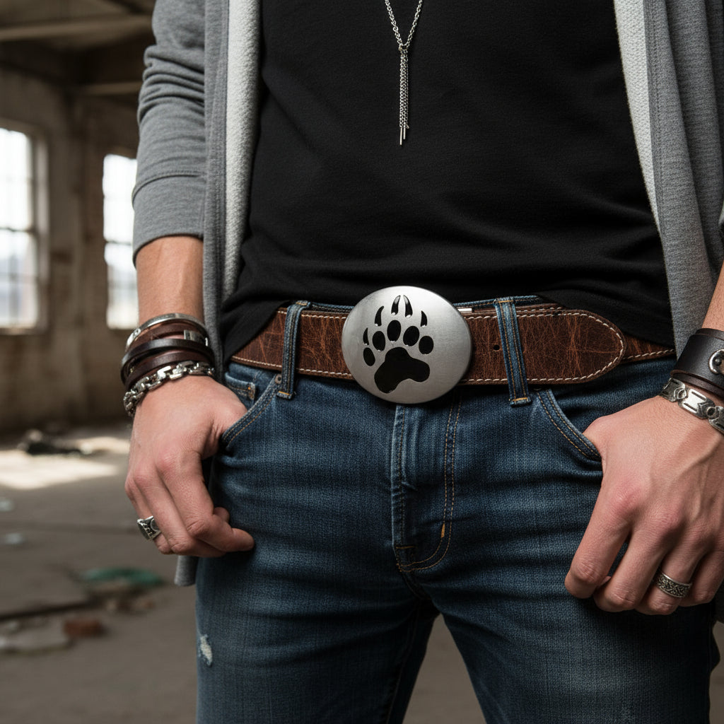 Add a touch of rugged Western charm to your outfit with this distinctive silver metal belt buckle featuring a bear foot print. Ideal for everyday wear or as a standout accessory for a party.