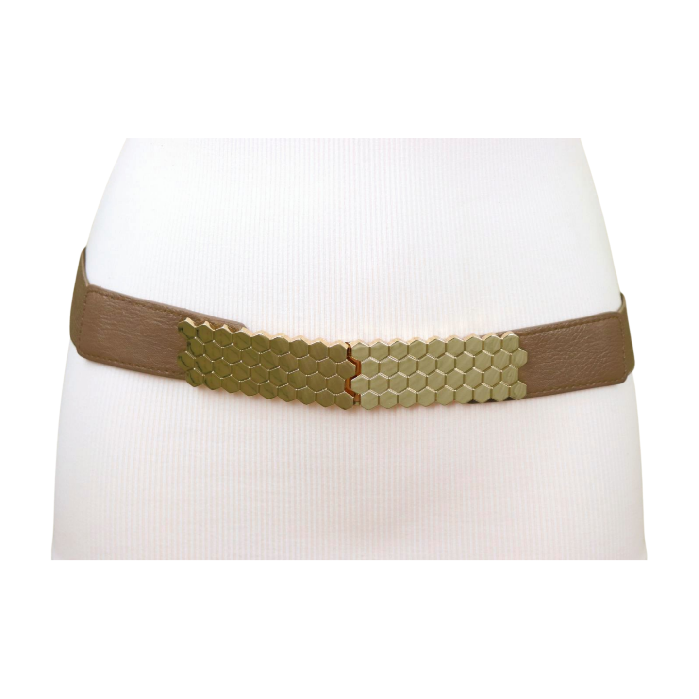 Introducing a Very Special Fashionable Belt - perfect for day, night, evening parties, or work. This brand-new belt features a unique design with a brown taupe faux leather and elastic fabric waistband, adorned with a gold metal beehive buckle, creating a stylish and versatile accessory.