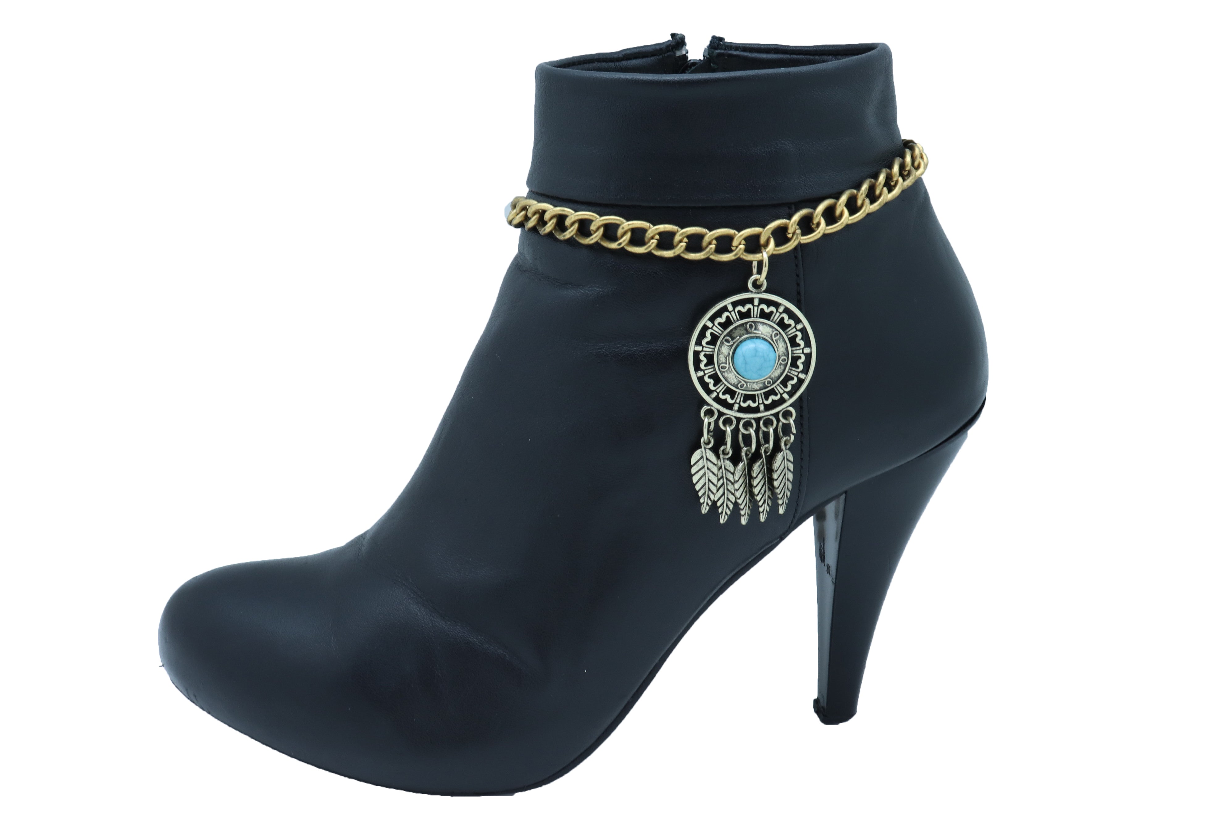 Antique Gold Metal Boot Chain Bracelet Shoe Feather Turquoise Blue Charm Ethnic