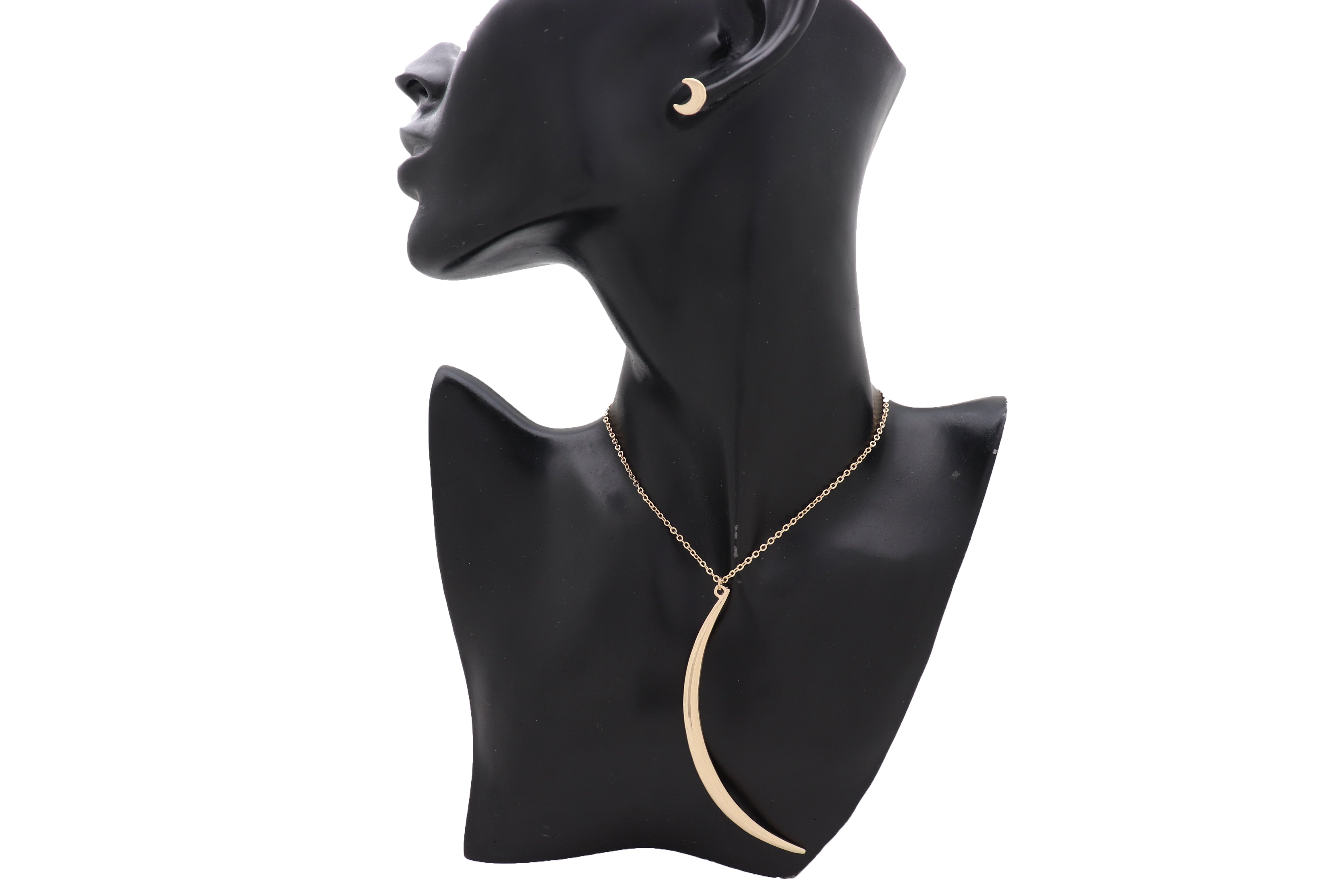 Unique and special fashion necklace with great chic for day or night wear all year around summer spring winter and fall Style : Fashion sexy trendy chic style NECKLACE + MATCHING EARRINGS SET Condition : Brand New Color : Gold metal chain links and charm Strand length : About 22" - 24" long Necklace drop : About 10" Pendant size: About 3 4/8" X 2/8" Very Special And Fashionable Necklace Beautiful For Every Day And For A Going Out Night.  |