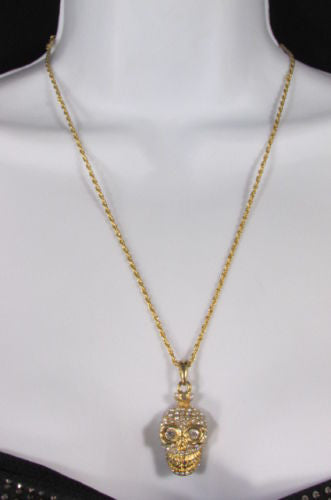 Gold Silver Metal Long Chain Skull Skeleton Head Multi Rhinestones Necklace