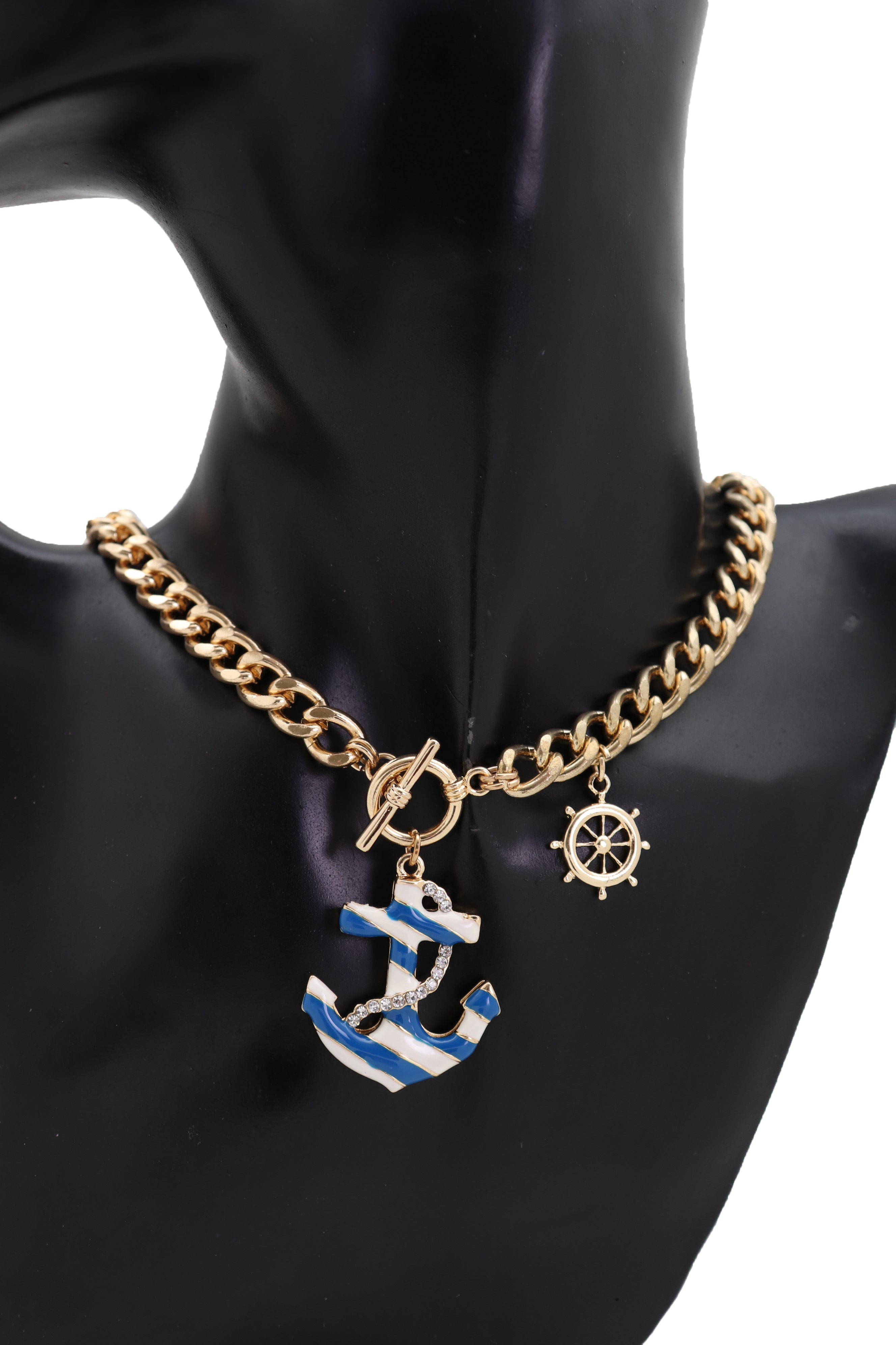Women Gold Metal Chain White Blue Stripes Anchor Charm Nautical Ship Necklace