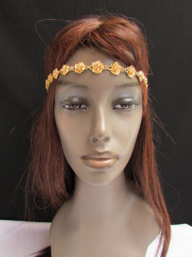 Gold Metal Elastic Head Chain Multi Flowers Leaves Hair