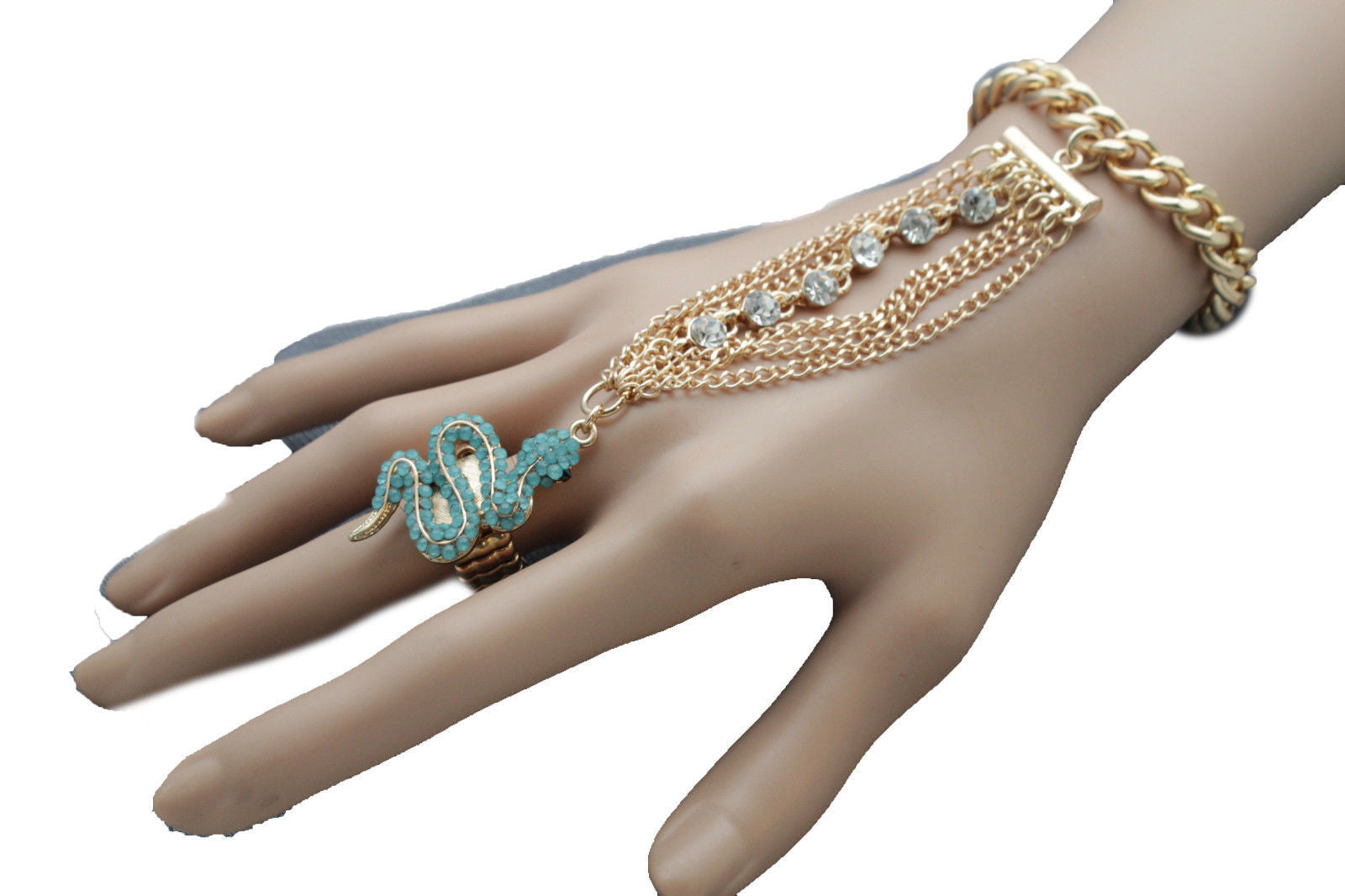 Gold Metal Hand Chain Bracelet Multi Rhinestone Turquoise Snake