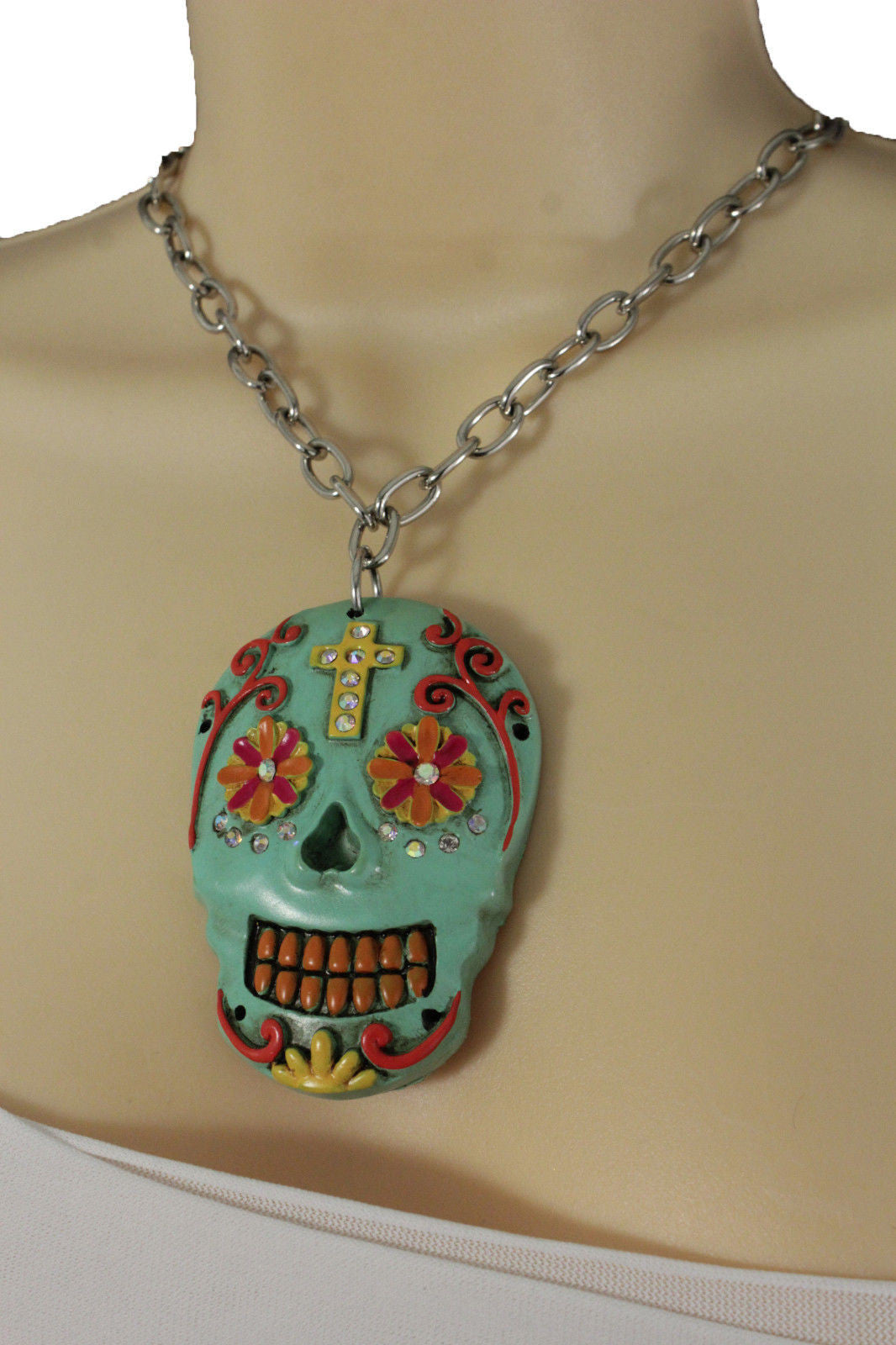 Color: Silver Metal Chains And Rhinestones + Blue Yellow Pink And Orange Skull
