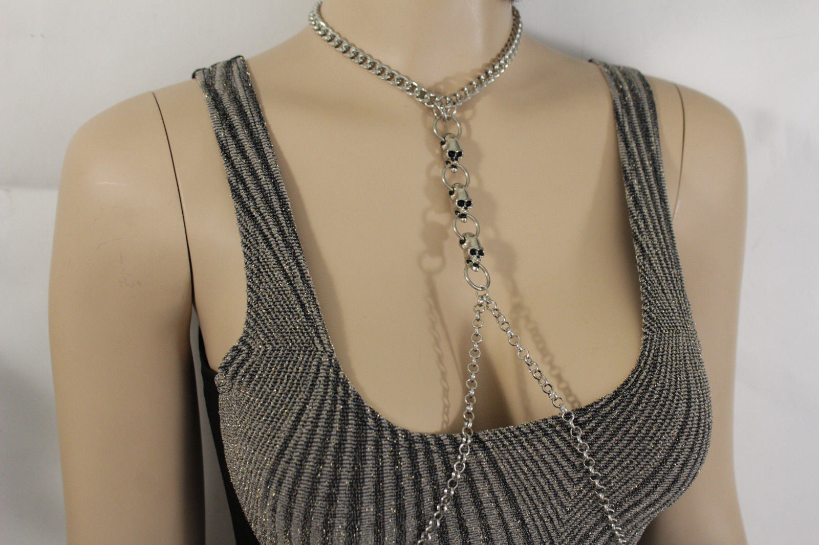 Silver Metal Body Chain Harness Necklace Skeleton Skulls