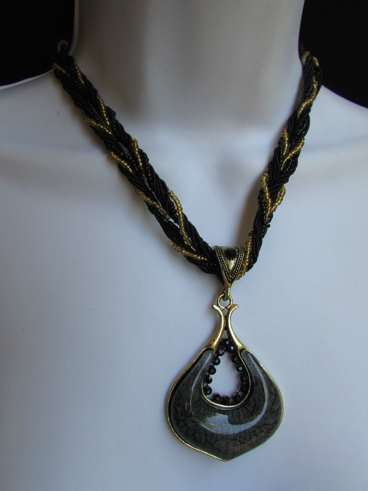 Multi Beas Chain Big Black Glass Drop Rhinestones Pendant 10" Strands Necklace