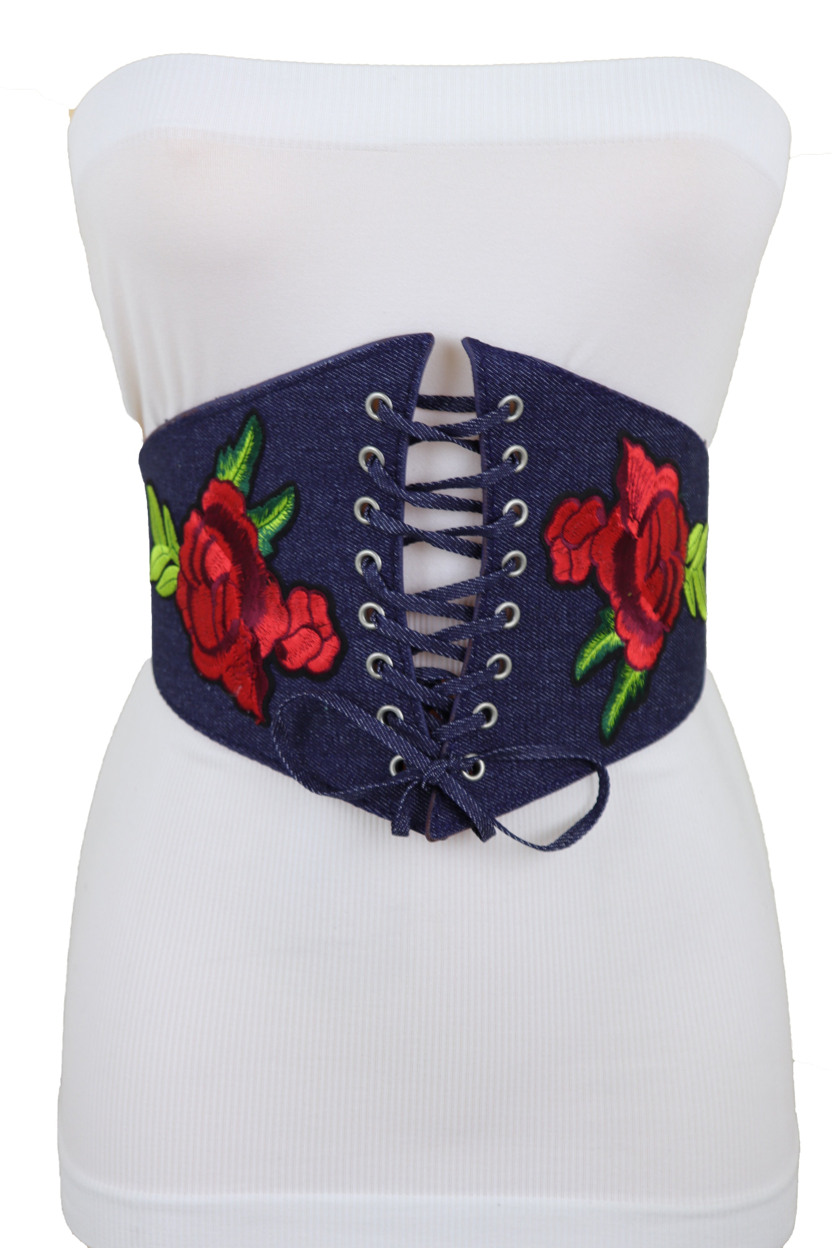 Dark Blue Denim High Waist Corset Elastic Wide Belt Red Rose Flowers S M