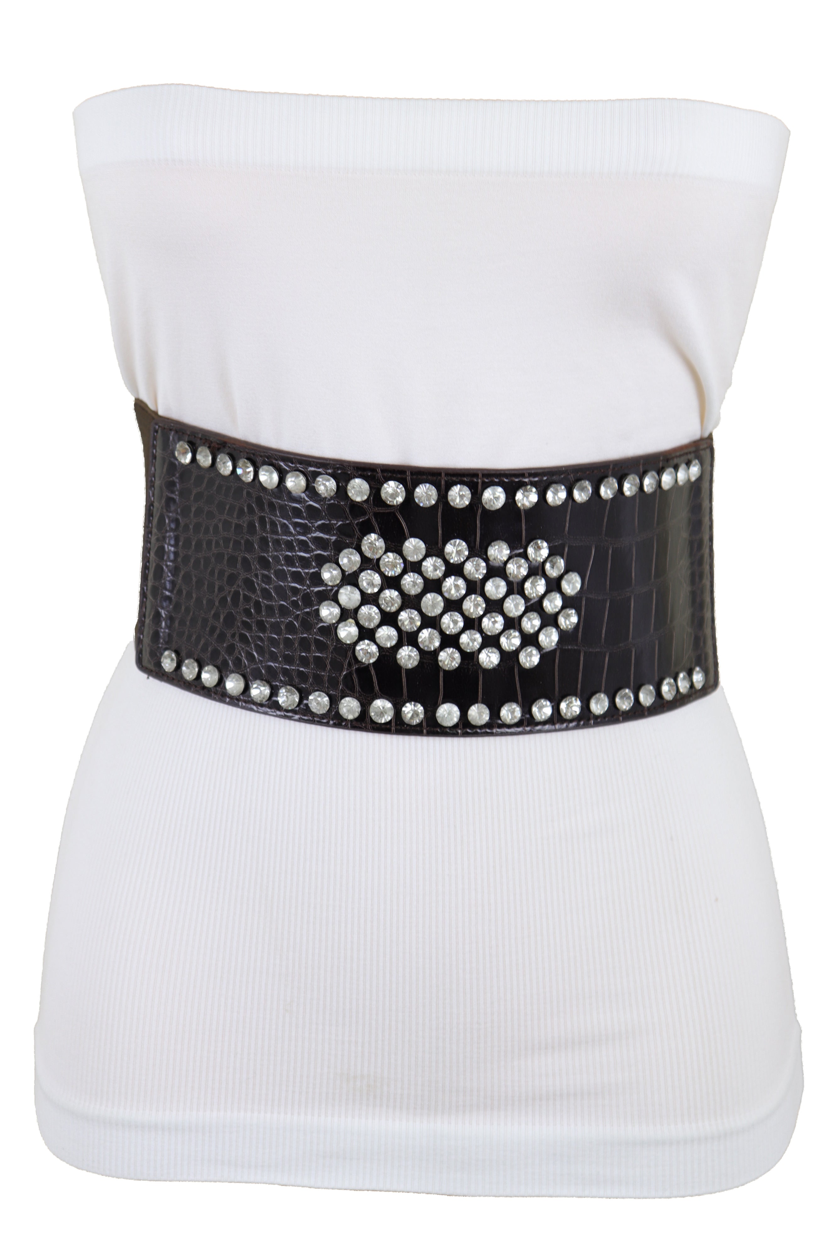 Dark Brown Faux Leather Elastic Wide Band Belt Silver Bling Shield Fit M L
