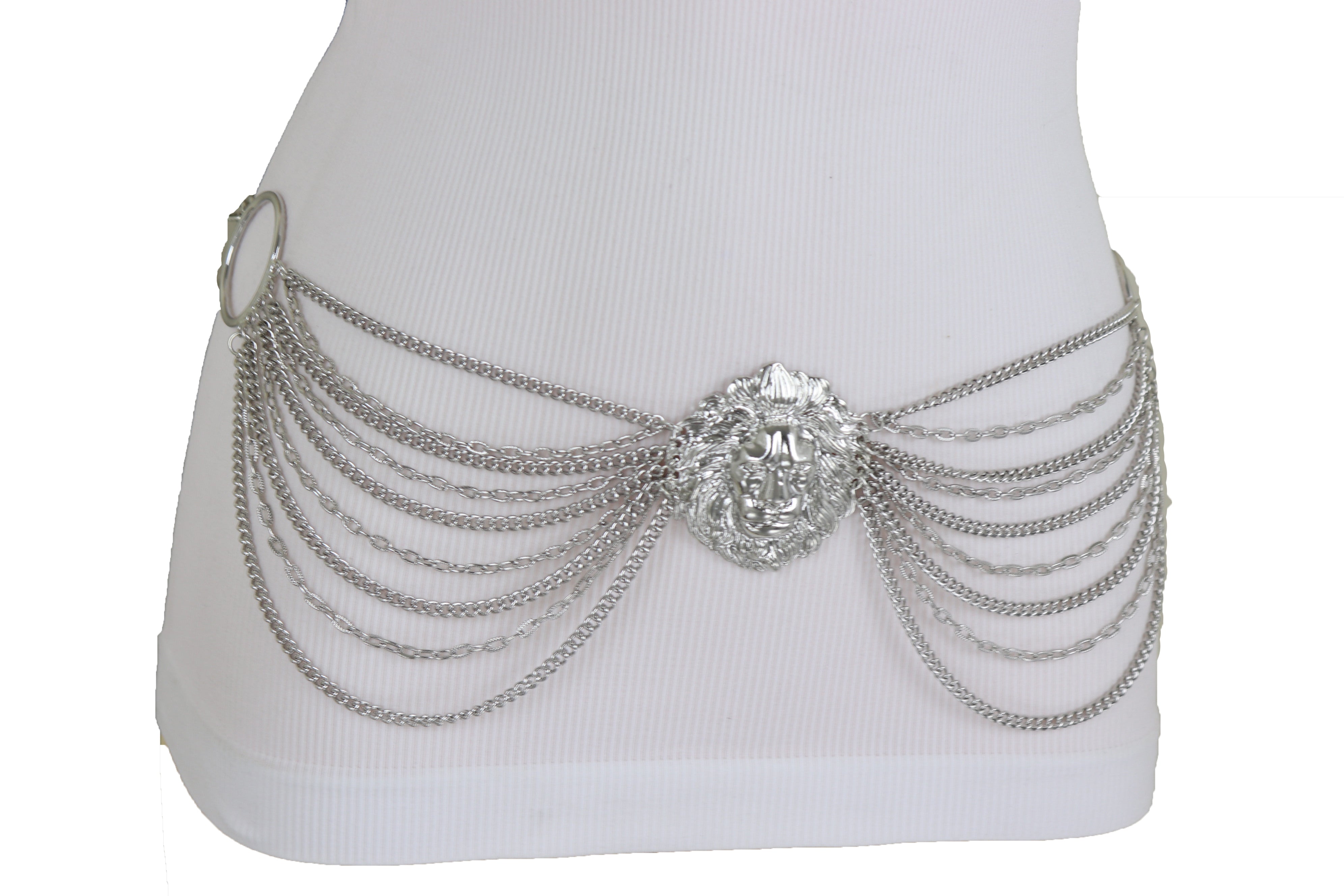 Silver Side Multi Waves Metal Chain Belt with Lion Head Pendant
