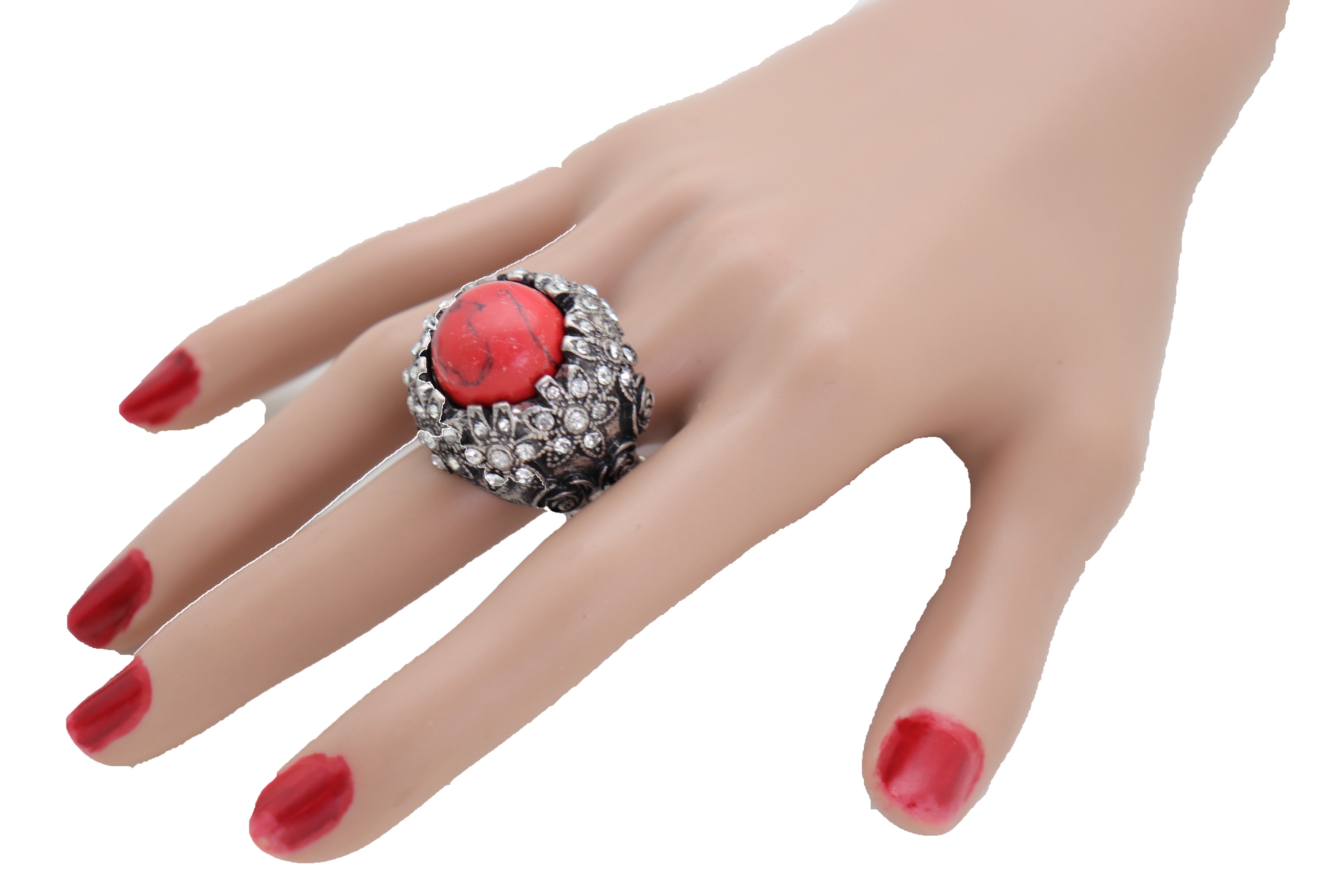 Silver Metal Red Bead Floral Filigree with Rhinestones Ring