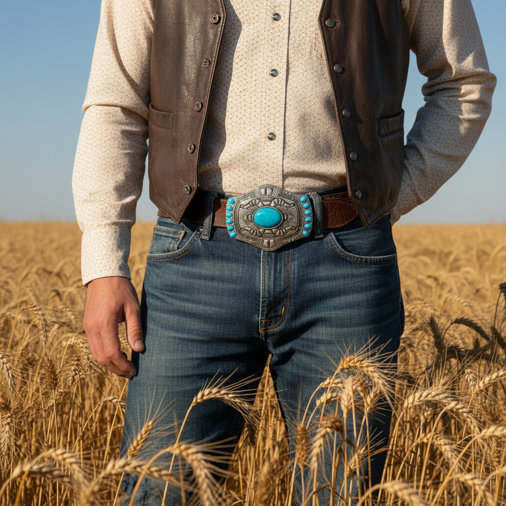 Western Style Ethnic Turquoise Beads Silver Metal Buckle