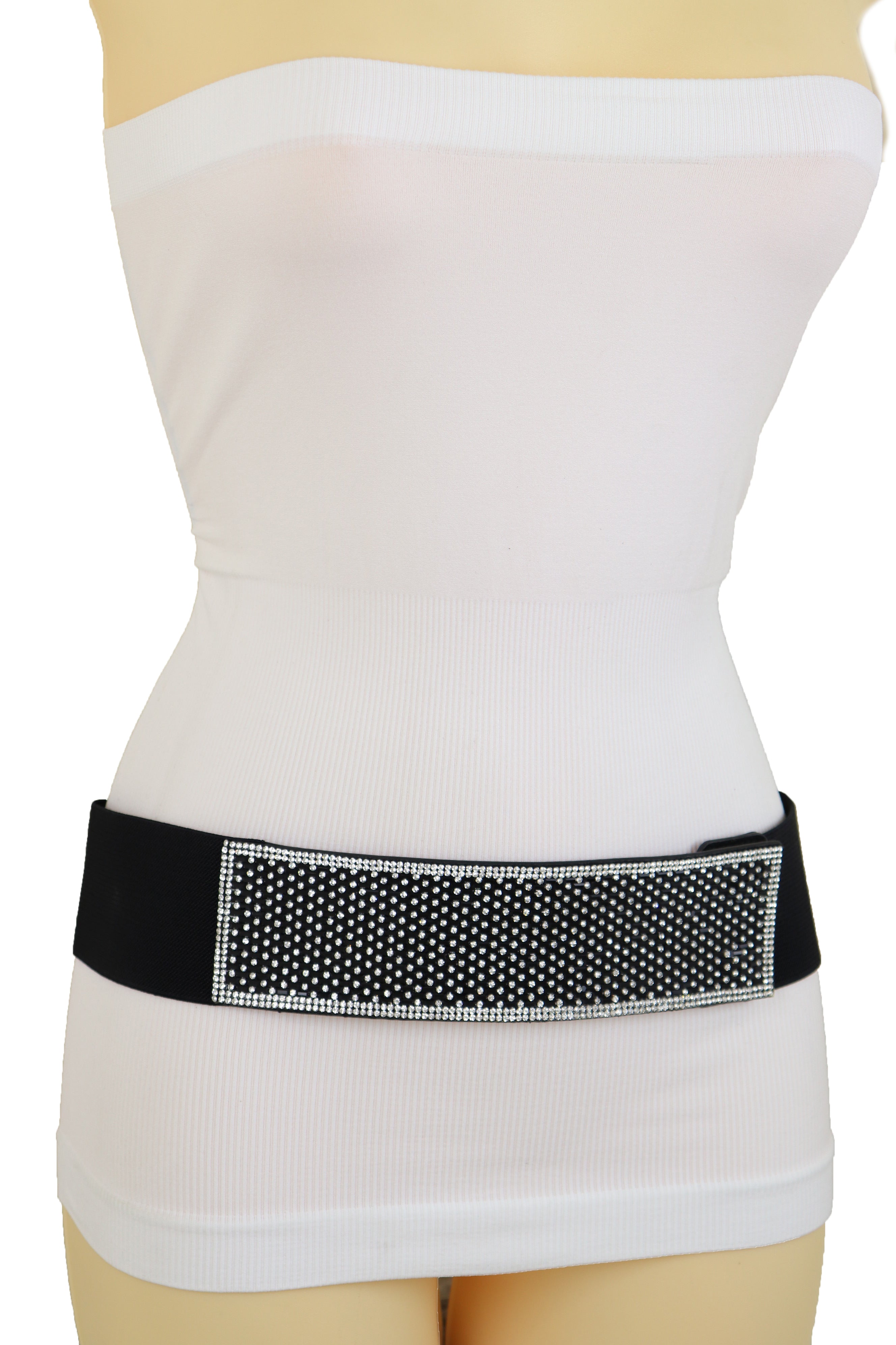 Women Elegant Fashion Belt Black Elastic Waistband Bling Long Plate Buckle Fits Sizes S M
