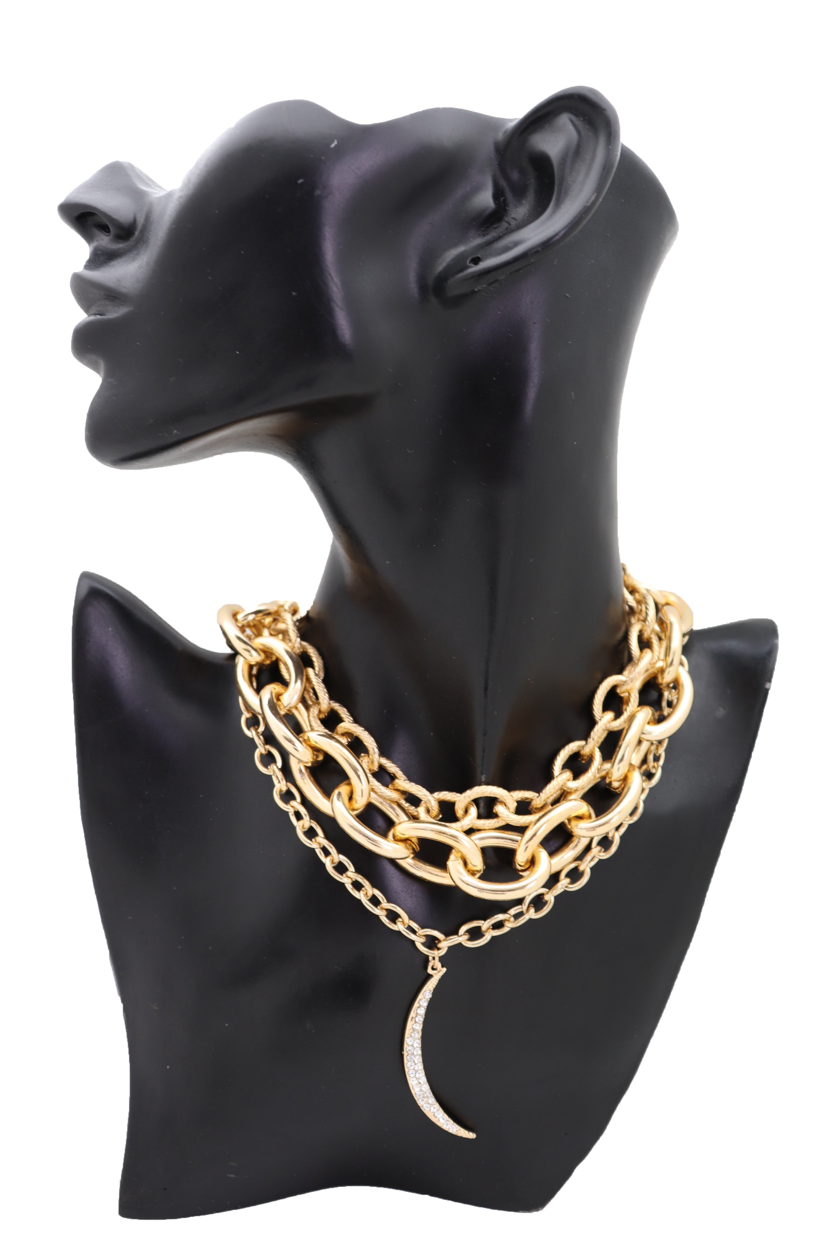 Gold Metal Chain Strand Bulky Bib Choker Short Necklace Moon Charm Bling Style