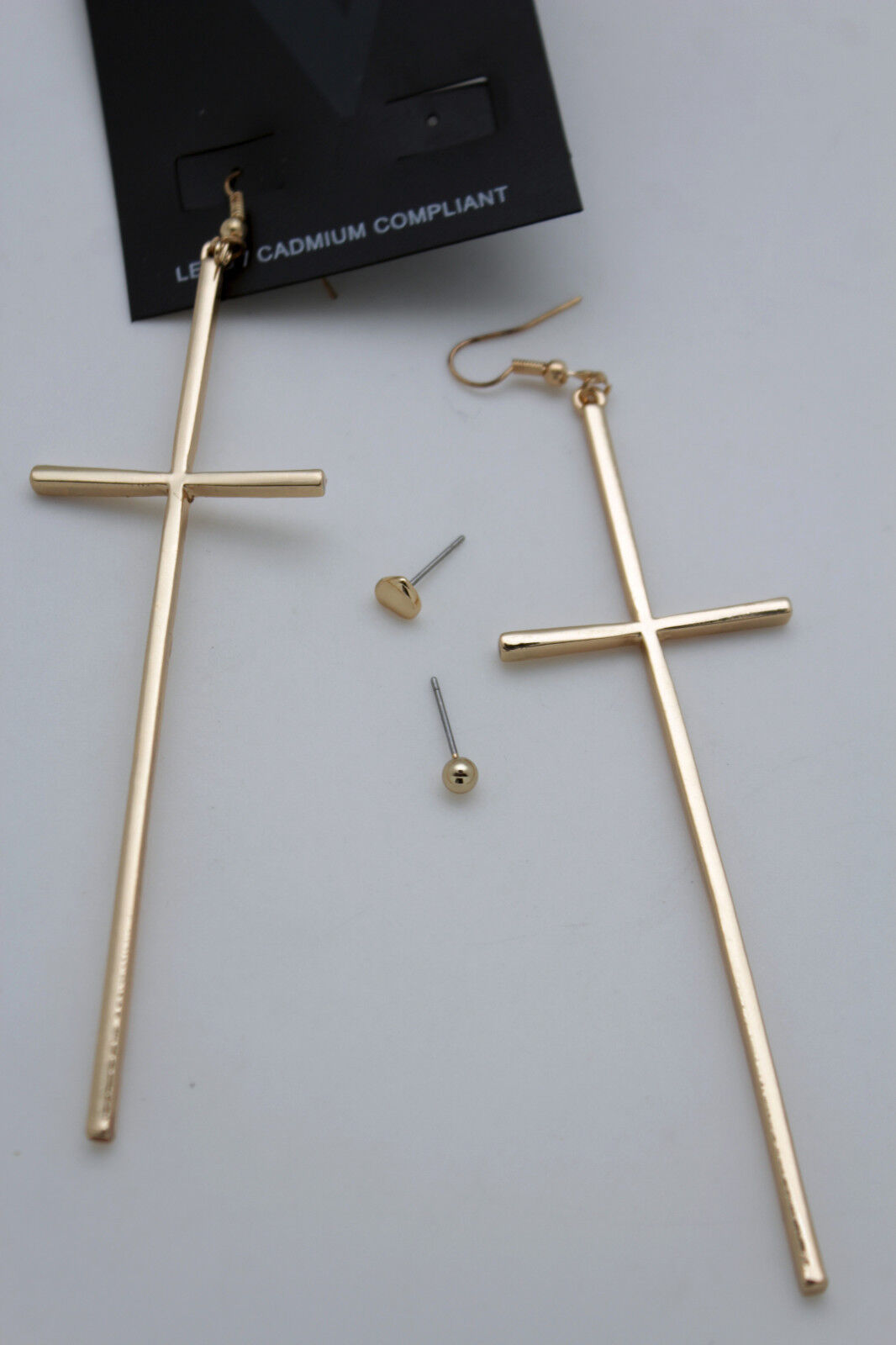 Each pair of earrings is designed to stand out while offering flexibility to match your outfit effortlessly. The Cross earrings measure 4" long, while the Heart earrings have a diameter of 1 4/8". The set comes brand new, packaged in a convenient 3-piece set, making it an ideal gift for yourself or a loved one.