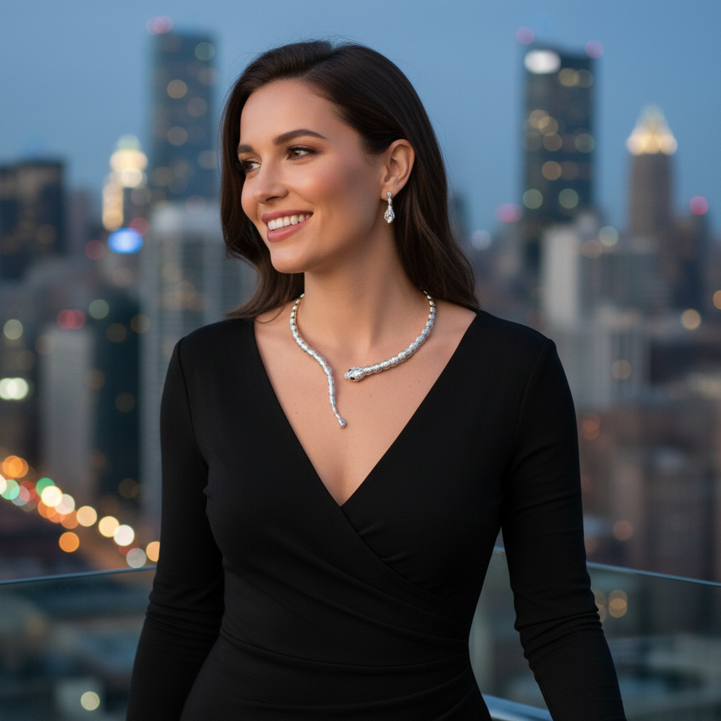 Give your neckline a little bite of sparkle. This Silver Serpent Collar Necklace wraps gracefully like a sculpted snake, dotted with light-catching crystals along the head and eyes. The flexible, segmented design lays flat and feels surprisingly comfortable—so you can look extra without feeling extra. Whether you’re styling a sleek blazer, a slip dress, or your favorite going-out top, this snake choker adds instant runway energy and a touch of mythic, Medusa-meets-modern glamour. Coordinating crystal studs complete the look in one easy, gift-ready set. Wear it for date night, concerts, holiday parties, Halloween costumes, prom, or anytime your outfit needs a bold, photo-worthy focal point. Unique and special fashion necklace with great pendant with a cute charm for day or night wear all year around summer spring winter and fall Style : Fashion - Sexy Necklace + matching earrings set Condition : Brand New